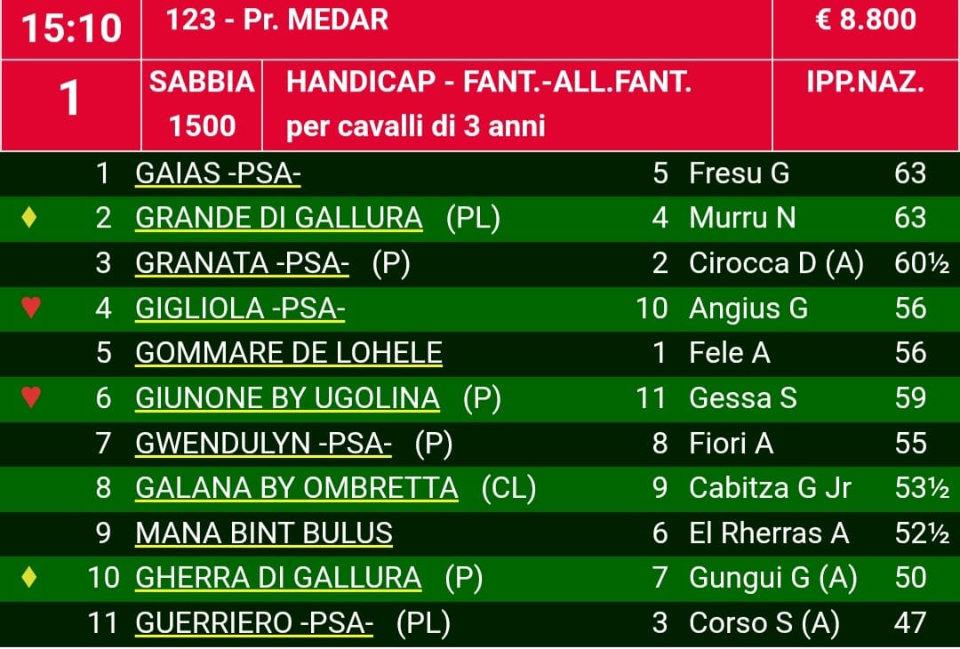 Premio Logudorese, 1650 metri, 5.500 euro – 1 Gemmaditrexenta (56 ½ Germano Marcelli); 2 Granata (56 ½ Davide Cirocca); 3 Goleador (55 ½ Raimondo Stefano Salu); 4 Sea Land (54 ½ Andrea Fele); 5 Gommare de Lohele (52 ½ Samuel Corso); 6 Gold Flying (54 Maikol Arras); 7 Gazzelone del Ma (54 Mario Sanna)